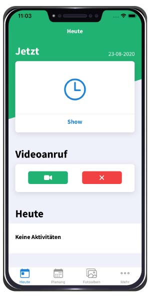 Der/Die Betreiber/-in der DayClock (in der Regel die Tochter, der Sohn oder die Betreuungsperson des/der Benutzers/-in) kann als Ankündigung eines Videoanrufs z.B. eine Nachricht mit seinem Foto auf die DayClock senden mit dem Text “Mama, ich rufe dich um 15 Uhr zum Videoanruf an”. Über das Videoanruf-Symbol in der DayClocks Kalender-App kann dann um 15 Uhr eine Bildanruf-Verbindung zur DayClock hergestellt werden. Auf der DayClock erscheint ein grüner Anruf, und dann wird die Verbindung hergestellt, ohne dass der/die Endbenutzer/-in die DayClock berühren muss. Nach dem Videoanruf trennt der/die Administrator/-in den Videoanruf durch Drücken der roten Anruftaste in der App. Gleichzeitig kehrt die DayClock auf den ursprünglichen Uhrenbildschirm zurück.